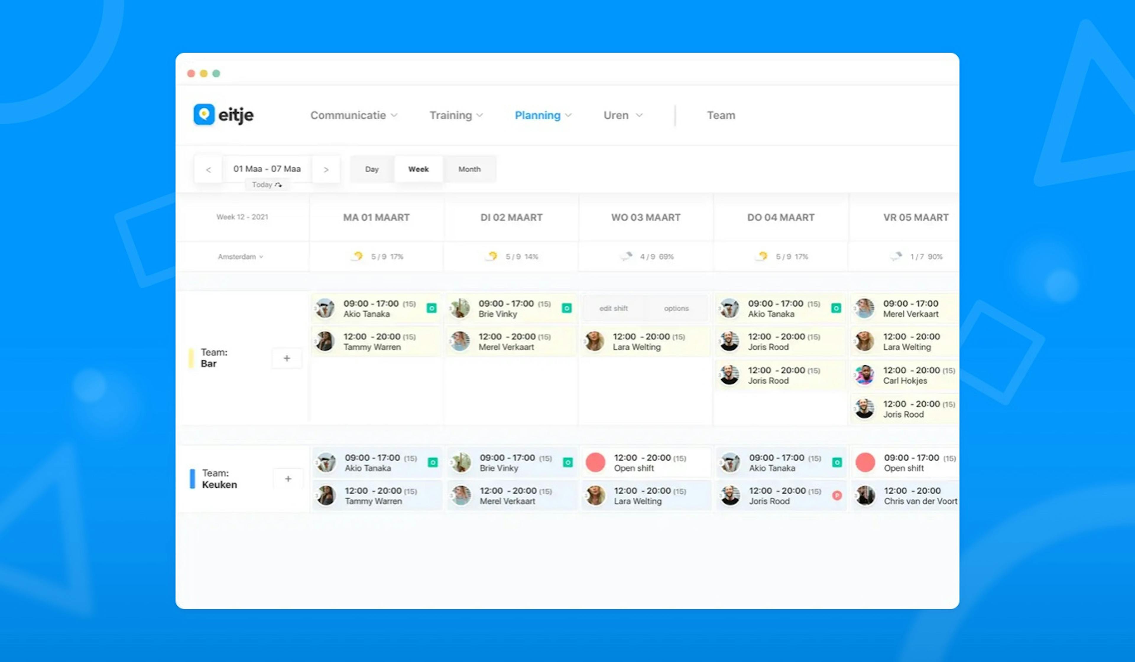 Het hoeft allemaal niet zo ingewikkeld te zijn om snel een goede personeelsplanning te maken. Met eitje haal jij de gemakkelijkste planning & urenregistratie tool van Nederland in huis, zonder in te boeten op functionaliteit. Zo kun jij zonder enige moeite snel starten met je eigen team en heb jij in no-time je planning online. Verder is eitje niet alleen de tool voor je personeelsplanning, maar brengen wij alles voor je teamleden bij elkaar. Zo sta jij in direct contact met je werknemers met onze communicatie tools, ervaar jij het gemak van een compleet digitaal kenniscentrum en komen daar dus nog de planning & urenregistratie functionaliteiten bij. Wel zo eenvoudig ;)