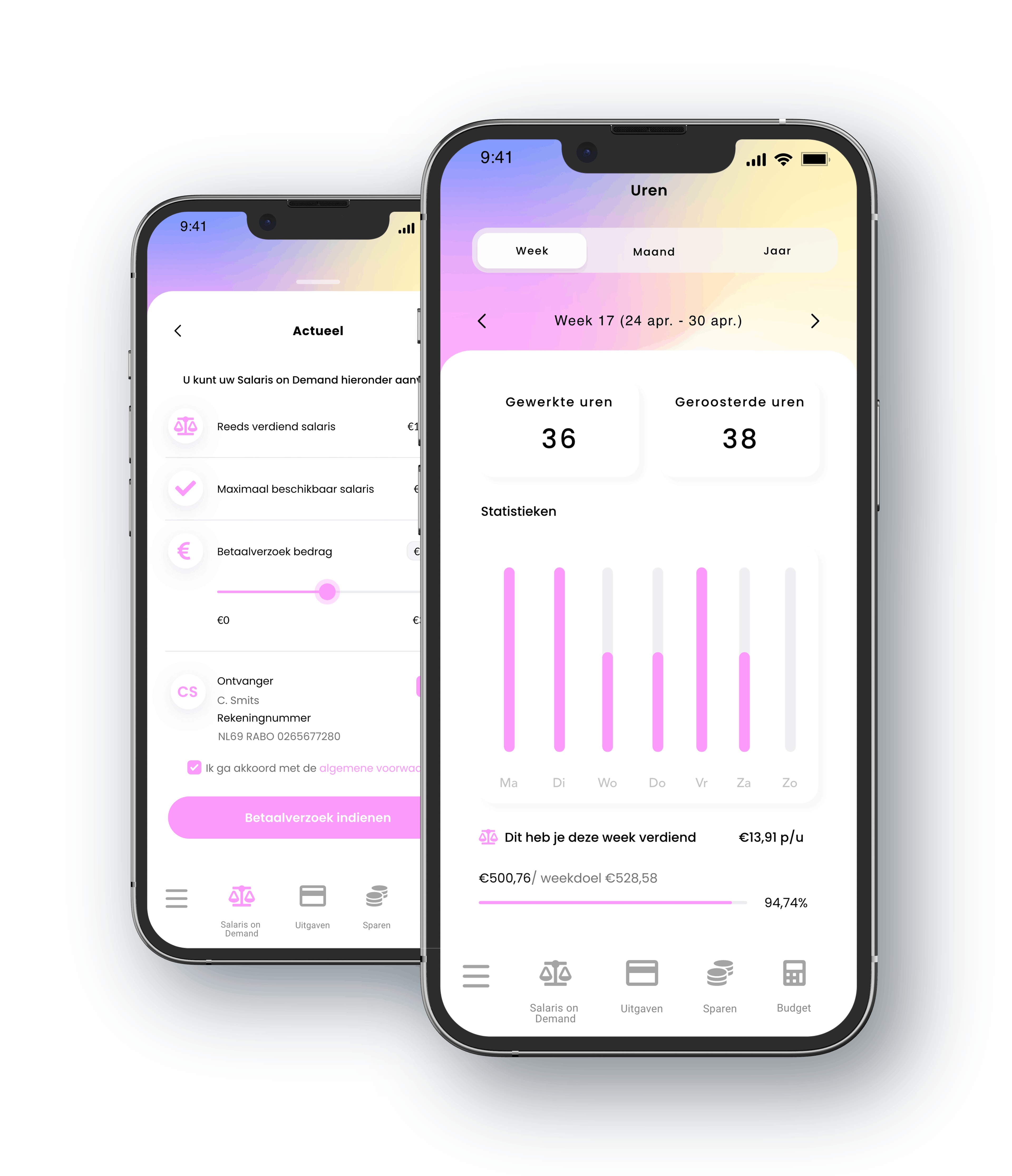 De toekomst van personal payrolling = Pay On Demand. Via onze app hebben zij real-time inzicht in hun verdiensten op en kunnen deze flexibel en on-demand uitbetalen binnen enkele seconden. Zonder te hoeven wachten op de verloning òf administratieve handelingen vanuit de werkgever. Zo kunnen zij zich beter focussen op werk en hebben méér motivatie door directe compensatie.