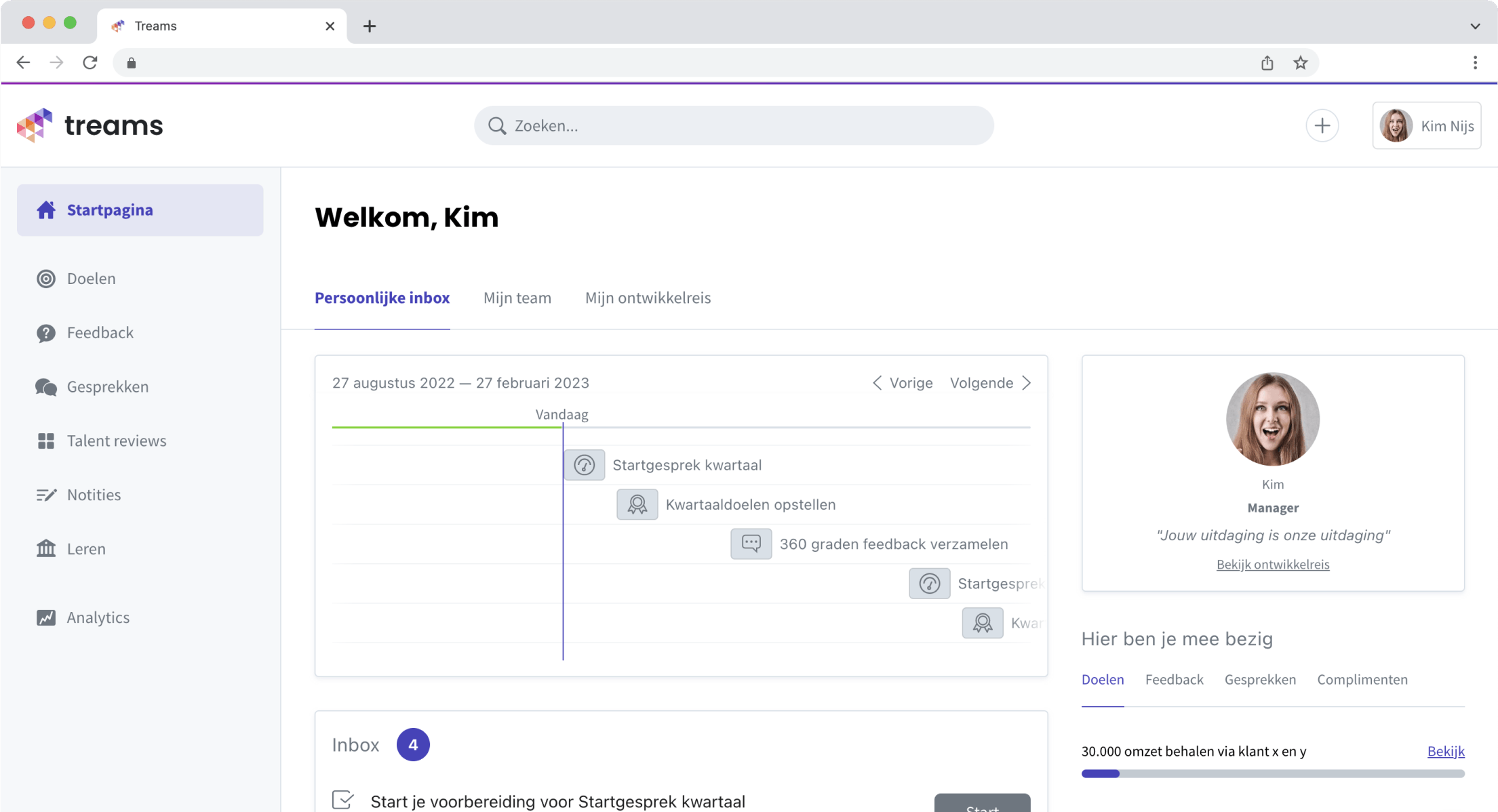 80% van de medewerkers vertrekken omdat ze zich niet gehoord voelen, laten we dat veranderen! Met het alles in één groeiplatform kun je doelen stellen, 360 feedback ontvangen, inzicht krijgen in medewerker engagement en gesprekken voeren. Dit alles met de medewerker in de hoofdrol. Samen motiveren we de medewerker om zelf controle te nemen over zijn of haar persoonlijke groei en ontwikkeling. Creëer een continue gesprekscyclus, breng talent in kaart en neem actie op negatief sentiment met inzichten uit de engagement pulse surveys, voordat het te laat is. Treams wordt jouw samenwerkingspartner. Volg de Treams opleiding en leer alle best practices voor het motiveren voor groei en activatie van het platform. Probeer het platform 14 dagen gratis of plan een demo via de website.