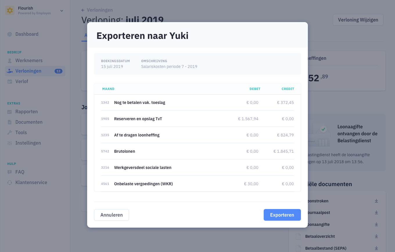 Na het doen van een verloning, dienen de kosten van je personeel verwerkt te worden in de boekhouding. Dat kun je doen door handmatig een memoriaalboeking te maken in Yuki. Het overtypen van de journaalposten kan een tijdrovend klusje zijn, maar met Employes niet meer! De koppeling tussen Employes en Yuki zorgt er namelijk voor dat de journaalposten automatisch aangemaakt worden.